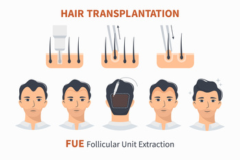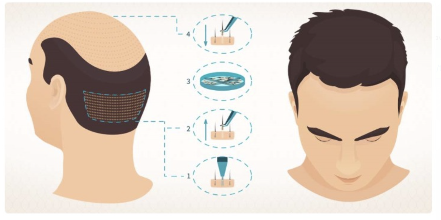 FUE yöntemi birkaç adımdan oluşur. Öncelikle saç köklerinin daha iyi tespit edilmesi ve saç ekiminin yapılacağı bölgenin daha net görülebilmesi için saçlar 1 mm uzunluğunda kalacak şekilde kesilir. Saç kökünün kullanılacağı bölge olan göğüs, sırt veya ense bölgesindeki kıllar da 1 mm boyunda olacak şekilde tıraşlanır. Daha sonra hastanın acı hissetmemesi için işlem yapılacak bölge lokal anestezi ile uyuşturularak bölge operasyona hazırlanır.